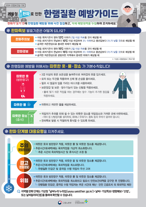 안전보건공단에서 제공하는 [2024년 한랭질환 예방가이드] 입니다.